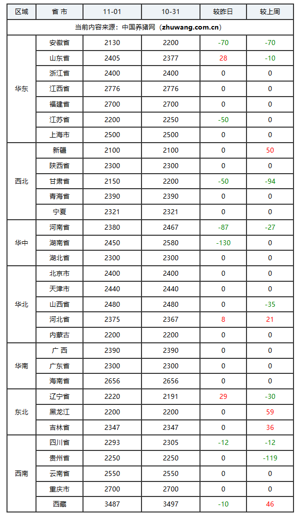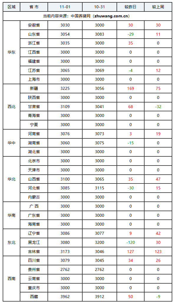 猪价下跌地区(14个):江西省、浙江省、福建省、上海市、新疆维吾尔自治区、陕西省、甘肃省、广西壮族自治区、四川省、吉林省、贵州省、云南省、西藏自治区、重庆市;下跌区间:0.02-0.26元/公斤;
