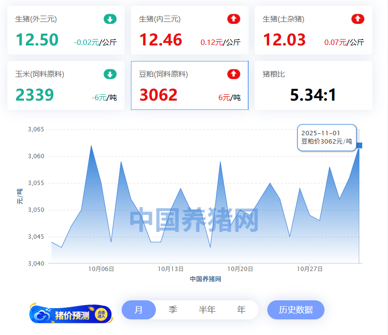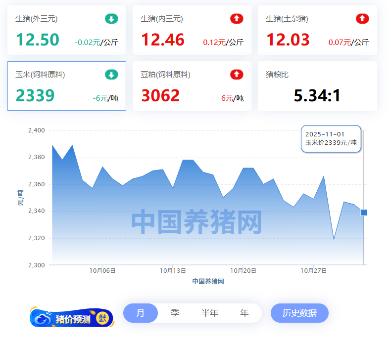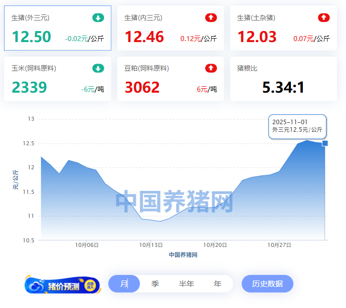 全国(生猪品种:外三元)均价为12.50元/公斤,猪价较昨日下跌0.02元/公斤,环比上涨2.29%,同比下跌27.75%;
