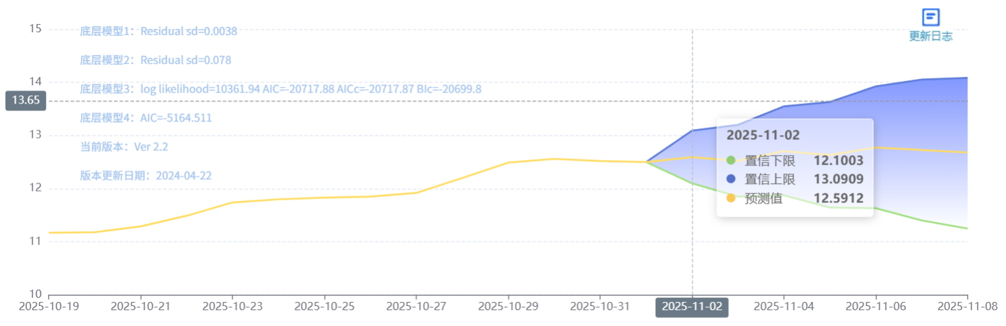 玄田算法是由项目课题组团队原创的非经典逻辑数值聚合理论和不确定性预测方法,构建了基于一致模算子的生猪价格预测模型。该模型采用的聚合函数及一致模相关理论与方法已获得多项国家自然科学基金和省级自然科学资金资助,并获得多项省级自然科学奖奖项。11月02日预测猪价为12.5912,置信区间在12.1003--13.0909之间。11月03日预测猪价为12.5225;11月04日预测猪价为12.7051。