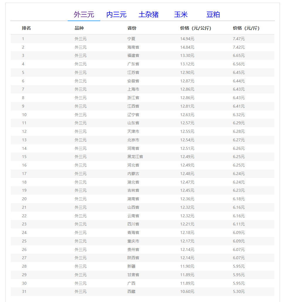 外三元排行前三:宁夏回族自治区14.94元/公斤、海南省14.84元/公斤、福建省13.30元/公斤;