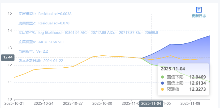 玄田算法是由项目课题组团队原创的非经典逻辑数值聚合理论和不确定性预测方法,构建了基于一致模算子的生猪价格预测模型。该模型采用的聚合函数及一致模相关理论与方法已获得多项国家自然科学基金和省级自然科学资金资助,并获得多项省级自然科学奖奖项。11月04日预测猪价为12.5682,置信区间在11.9018--13.2622之间。11月05日预测猪价为12.6660;11月06日预测猪价为12.6422。