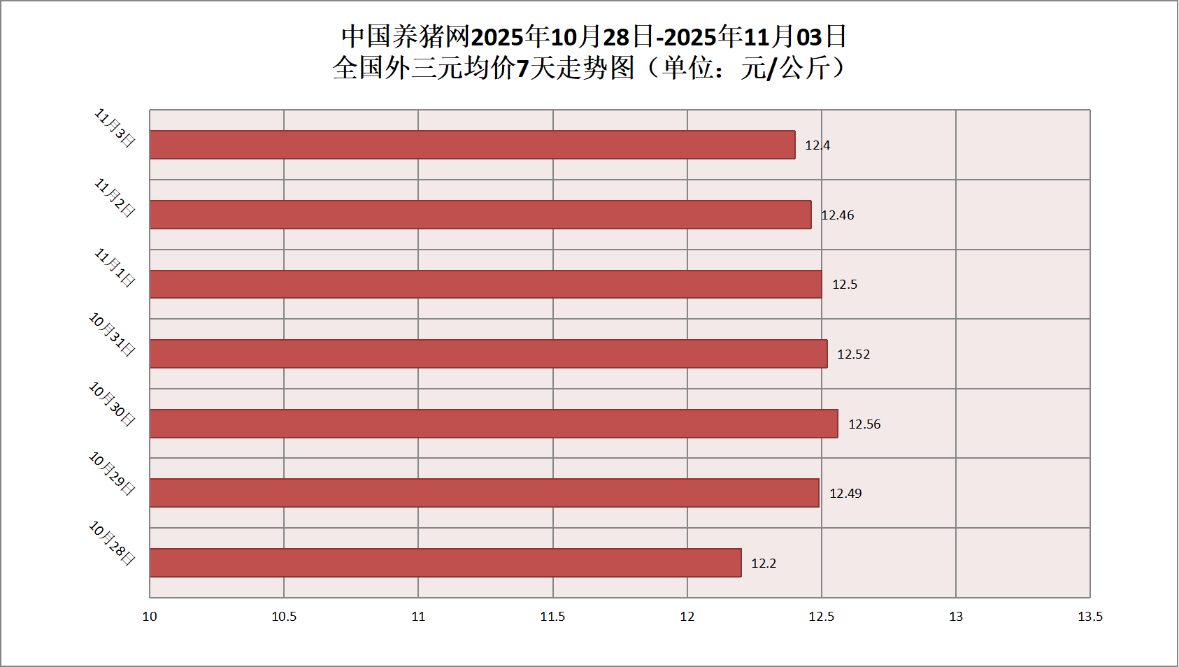 2025年11月03日(星期一),据中国养猪网猪价系统监测,全国外三元均价为12.40元/公斤,猪价较昨日(12.46元/公斤)下跌了0.06元/公斤,较上月(11.87元/公斤)上涨了0.53元/公斤。