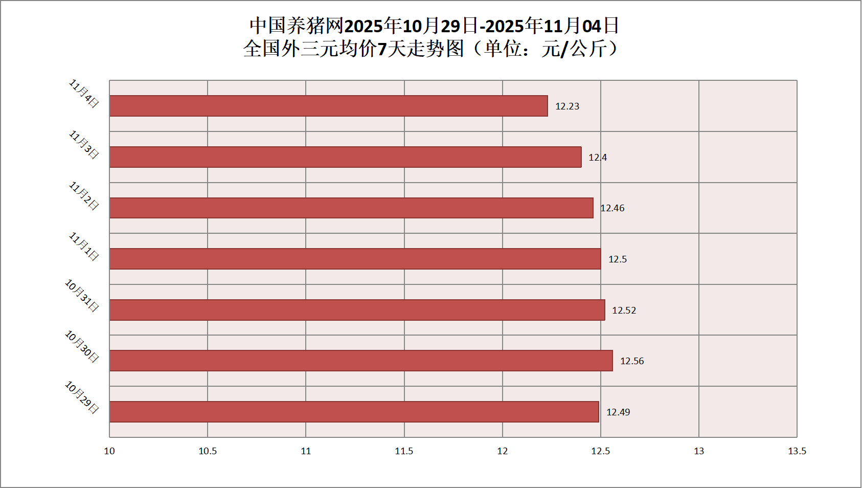 2025年11月04日(星期二),据中国养猪网猪价系统监测,全国外三元均价为12.23元/公斤,猪价较昨日(12.40元/公斤)下跌了0.17元/公斤,较上月(12.15元/公斤)上涨了0.08元/公斤。