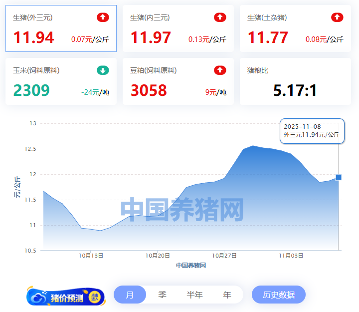 全国(生猪品种:内三元)均价为11.97元/公斤,猪价较昨日上涨0.13元/公斤,环比下跌3.19%,同比下跌29.21%;