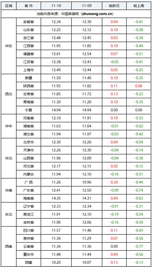 猪价上涨地区(20个):安徽省、浙江省、上海市、河北省、陕西省、北京市、云南省、青海省、贵州省、重庆市、江西省、福建省、海南省、四川省、山东省、广西壮族自治区、新疆维吾尔自治区、甘肃省、河南省、西藏自治区;上涨区间:0.02-0.30元/公斤;