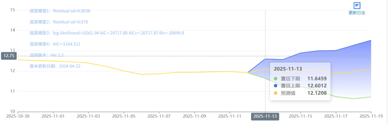 玄田算法是由项目课题组团队原创的非经典逻辑数值聚合理论和不确定性预测方法,构建了基于一致模算子的生猪价格预测模型。该模型采用的聚合函数及一致模相关理论与方法已获得多项国家自然科学基金和省级自然科学资金资助,并获得多项省级自然科学奖奖项。11月13日预测猪价为12.1208,置信区间在11.6459--12.6012之间。11月14日预测猪价为11.9051;11月15日预测猪价为12.0600。