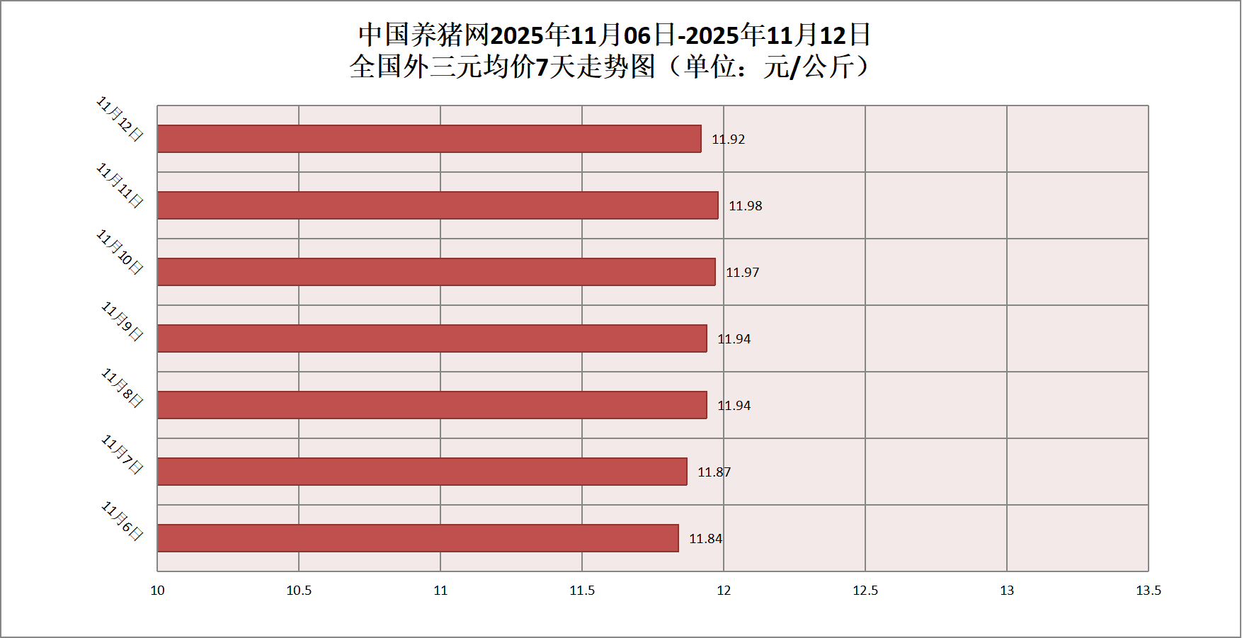 2025年11月12日(星期三),据中国养猪网猪价系统监测,全国外三元均价为11.92元/公斤,猪价较昨日(11.98元/公斤)下跌了0.06元/公斤,较上月(10.94元/公斤)上涨了0.98元/公斤。
