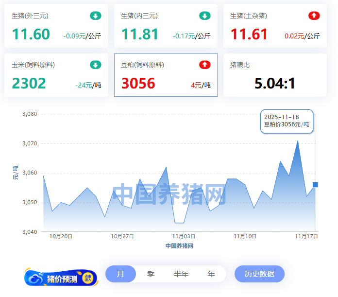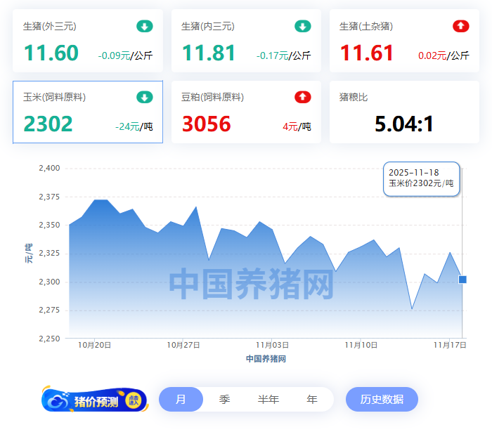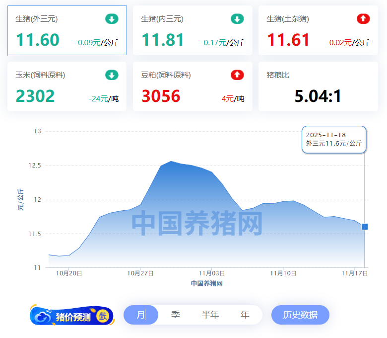 全国(生猪品种:土杂猪)均价为11.61元/公斤,猪价较昨日上涨0.02元/公斤,环比上涨4.69%,同比下跌29.25%;