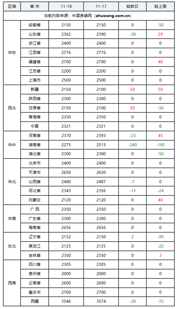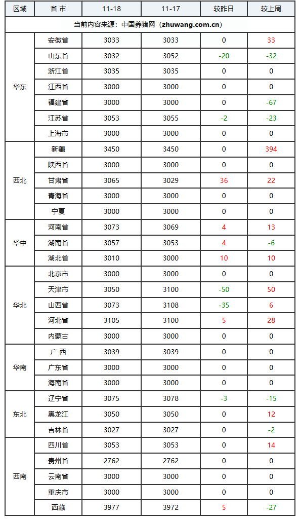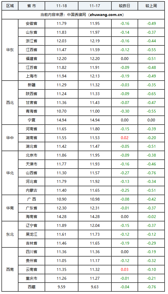 猪价下跌地区(26个):安徽省、上海市、广西壮族自治区、贵州省、广东省、甘肃省、山东省、新疆维吾尔自治区、内蒙古自治区、重庆市、辽宁省、