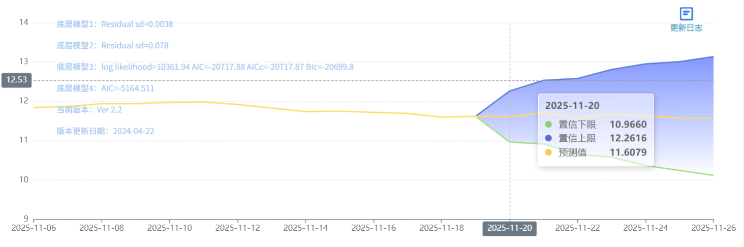 玄田算法是由项目课题组团队原创的非经典逻辑数值聚合理论和不确定性预测方法,构建了基于一致模算子的生猪价格预测模型。该模型采用的聚合函数及一致模相关理论与方法已获得多项国家自然科学基金和省级自然科学资金资助,并获得多项省级自然科学奖奖项。11月20日预测猪价为11.6079,置信区间在10.9660--12.2616之间。11月21日预测猪价为11.7109;11月22日预测猪价为11.5894。