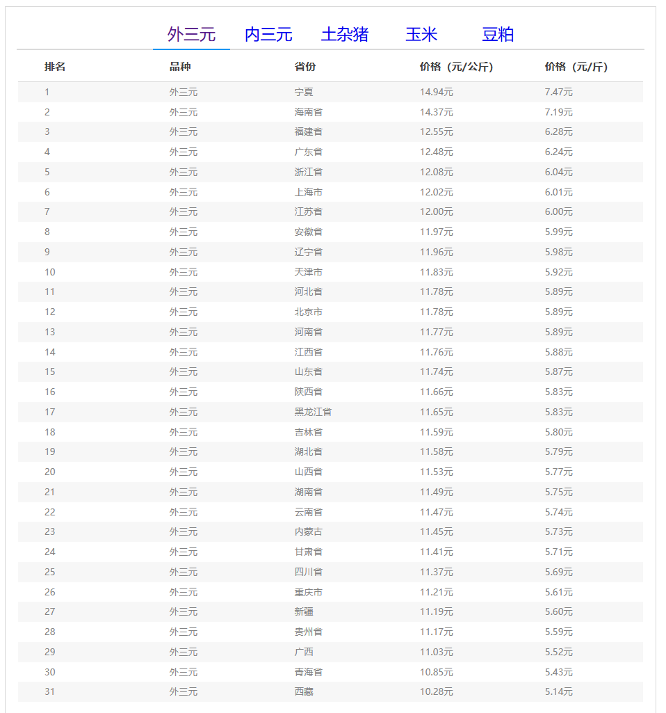 外三元排行前三:宁夏回族自治区14.94元/公斤、海南省14.37元/公斤、福建省12.55元/公斤;