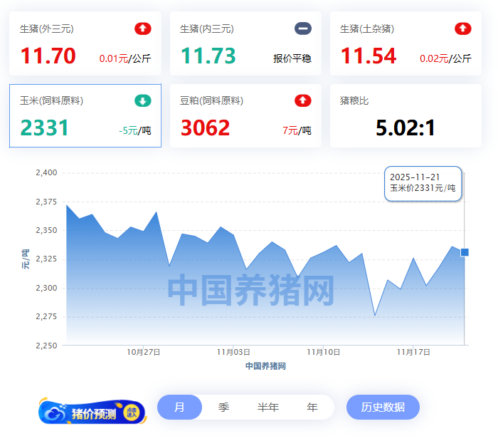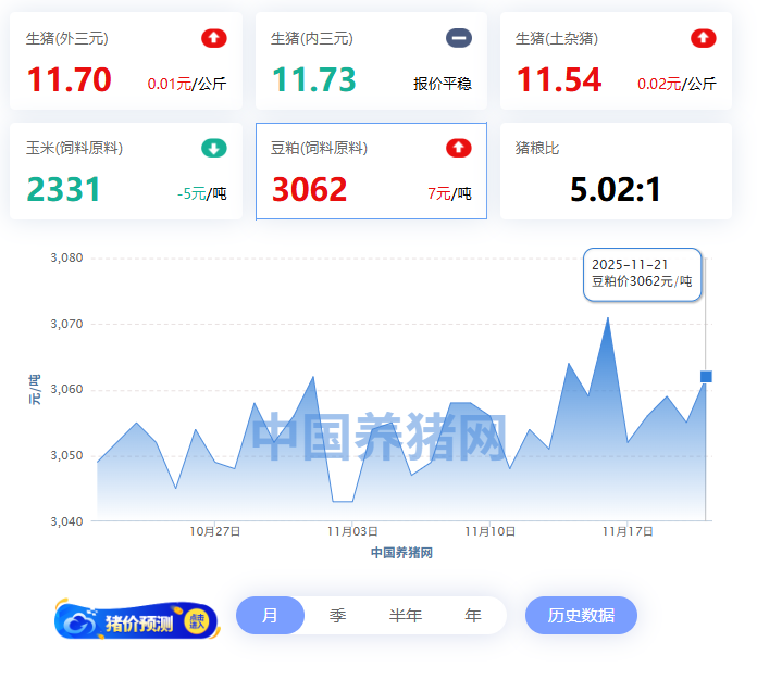 全国(生猪品种:外三元)均价为11.70元/公斤,猪价较昨日上涨0.01元/公斤,环比上涨3.63%,同比下跌27.78%;