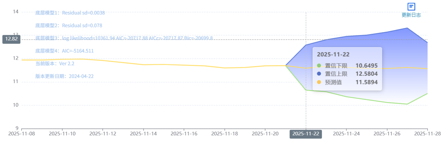 玄田算法是由项目课题组团队原创的非经典逻辑数值聚合理论和不确定性预测方法,构建了基于一致模算子的生猪价格预测模型。该模型采用的聚合函数及一致模相关理论与方法已获得多项国家自然科学基金和省级自然科学资金资助,并获得多项省级自然科学奖奖项。11月22日预测猪价为11.5894,置信区间在10.6495--12.5804之间。11月23日预测猪价为11.6676;11月24日预测猪价为11.6284。