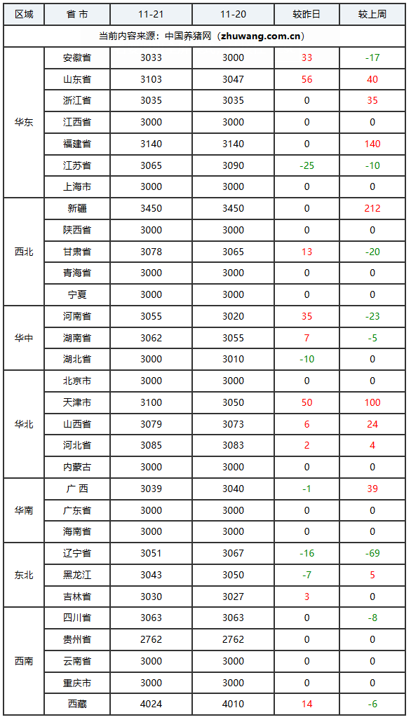 根据中国养猪网11月21日的数据来看,全国生猪价格整体呈现窄幅震荡态势,区域间走势有所分化。此番猪价延续涨势主要受到以下因素推动:首先,前期猪价持续探底导致行业普遍陷入亏损,养殖端对低价抵触情绪增强,散户及规模猪场均出现惜售行为,同时大型养殖企业主动控量挺价,压栏减供现象增多,市场供应压力有所缓解,行业看涨预期逐渐升温。其次,随着气温下降,居民家庭猪肉消费需求稳步回暖,下游屠宰场订单增加,开工率小幅提升,白条猪走货速度加快,消费面对行情形成有力支撑。另外,即将进入传统腌腊旺季,市场对后续需求抱有乐观预期,普遍存在压栏待涨心态,市场惜售情绪进一步发酵,共同推动生猪市场情绪与价格同步上行。