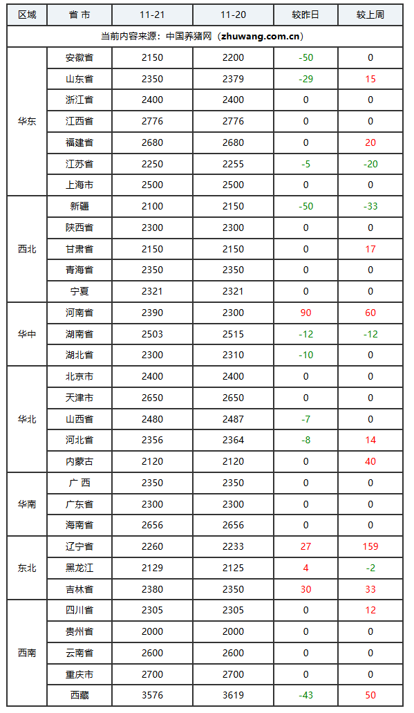猪价下跌地区(13个):山东省、浙江省、江苏省、新疆维吾尔自治区、上海市、甘肃省、河南省、湖南省、河北省、北京市、山西省、辽宁省、黑龙江省;下跌区间:0.01-0.11元/公斤;