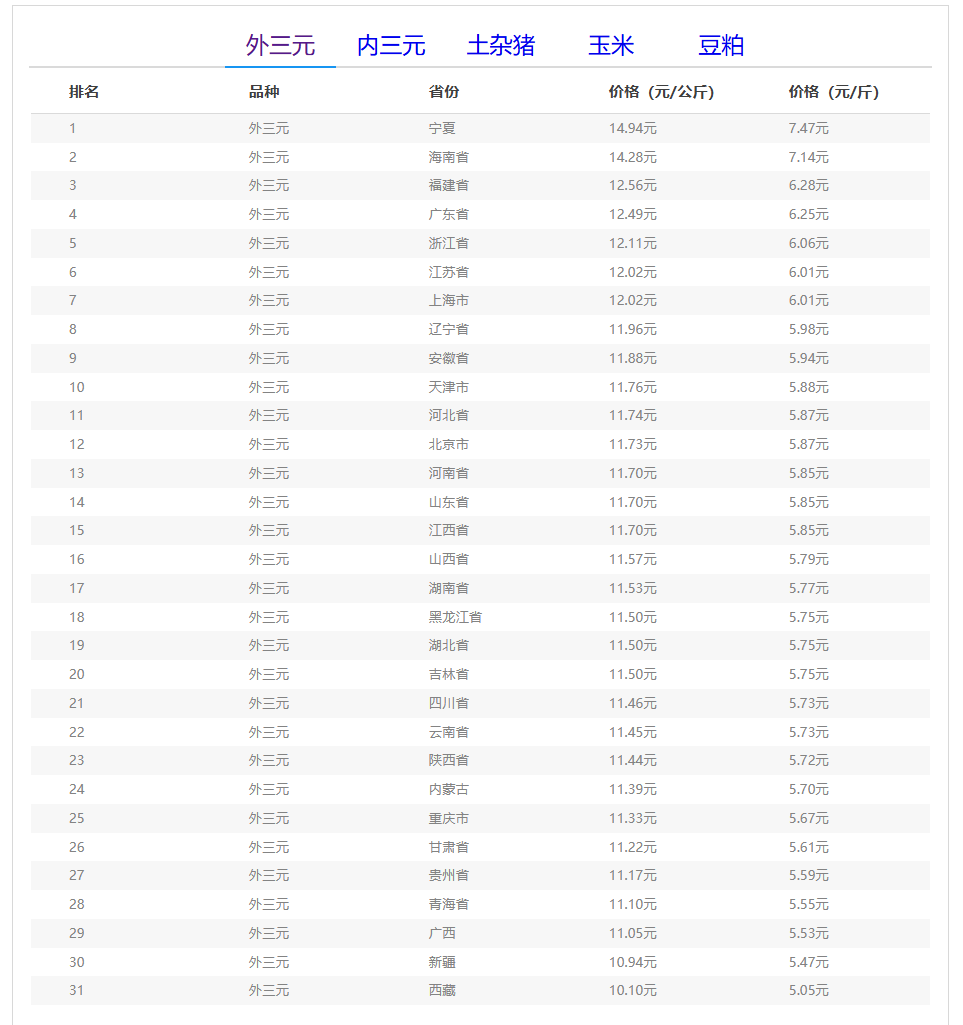 全国外三元生猪价格排行榜