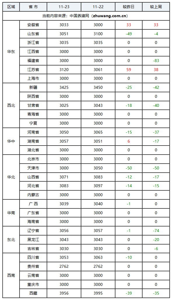 猪价下跌地区(15个):安徽省、山东省、上海市、江西省、陕西省、海南省、内蒙古自治区、湖北省、西藏自治区、吉林省、云南省、新疆维吾尔自治区、甘肃省、河南省、黑龙江省;下跌区间:0.01-0.22元/公斤;
