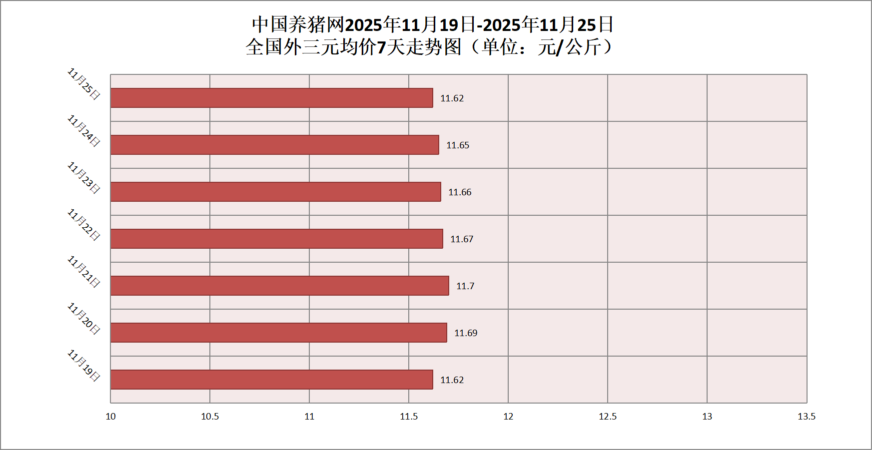 2025年11月25日(星期二),据中国养猪网猪价系统监测,全国外三元均价为11.62元/公斤,猪价较昨日(11.65元/公斤)下跌了0.03元/公斤,较上月(11.83元/公斤)下跌了0.21元/公斤。