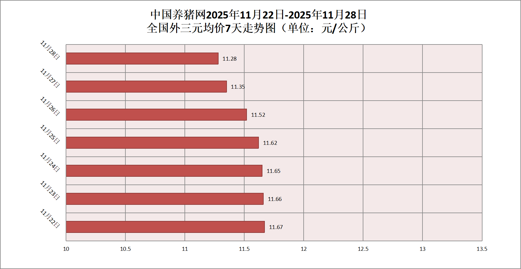 2025年11月28日(星期五),据中国养猪网猪价系统监测,全国外三元均价为11.28元/公斤,猪价较昨日(11.35元/公斤)下跌了0.07元/公斤,较上月(12.20元/公斤)下跌了0.92元/公斤。