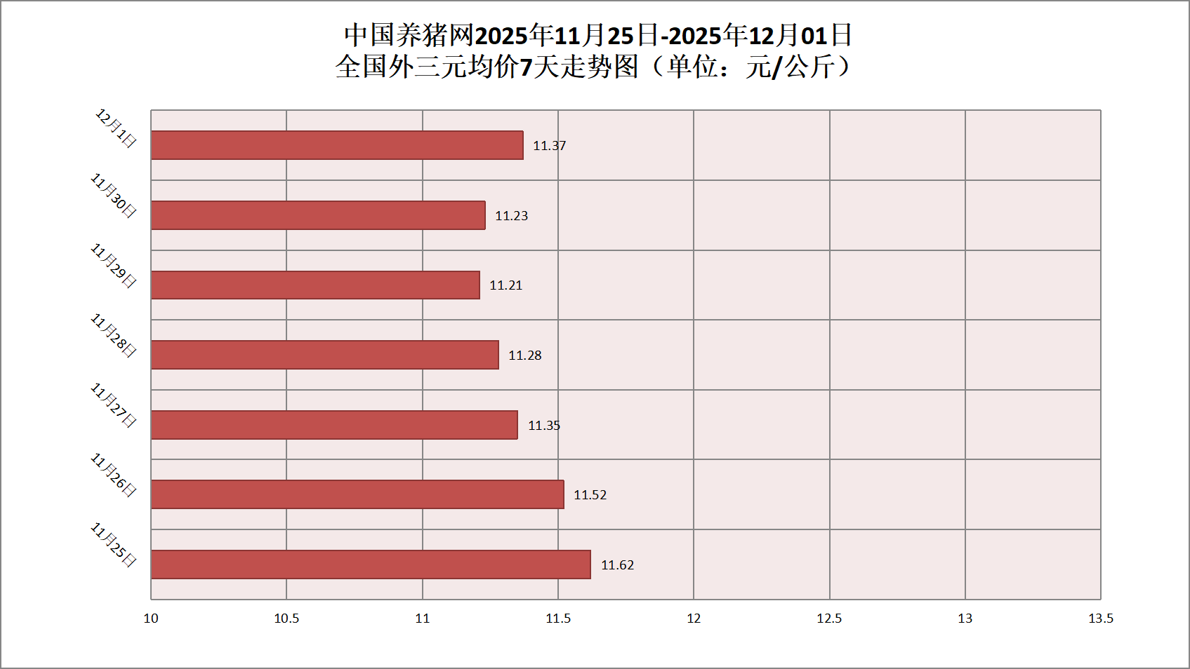 2025年12月01日(星期一),据中国养猪网猪价系统监测,全国外三元均价为11.37元/公斤,猪价较昨日(11.23元/公斤)上涨0.14元/公斤,较上月(12.5元/公斤)下跌了1.13元/公斤。