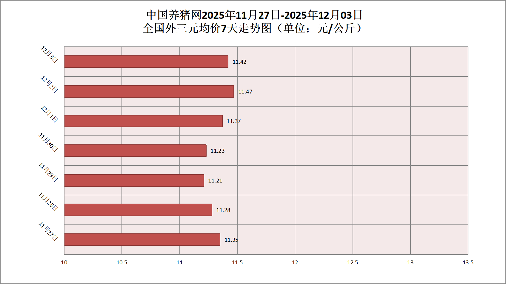 2025年12月03日(星期三),据中国养猪网猪价系统监测,全国外三元均价为11.42元/公斤,猪价较昨日(11.47元/公斤)下跌0.05元/公斤,较上月(12.4元/公斤)下跌了0.98元/公斤。