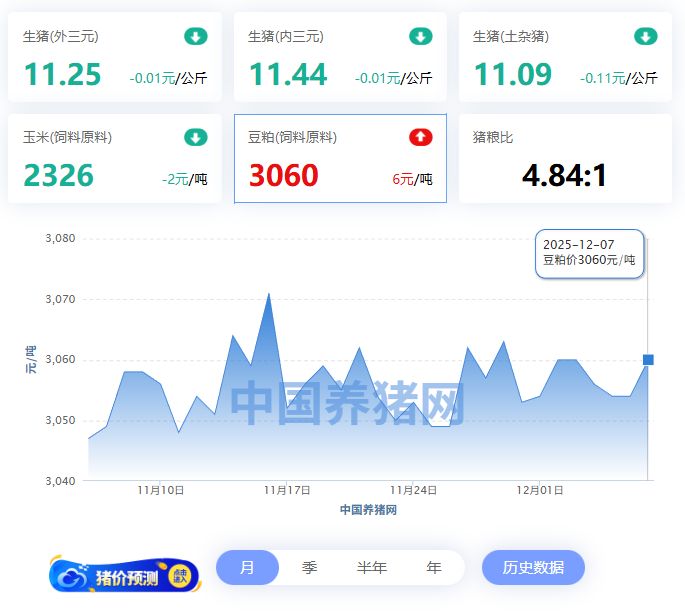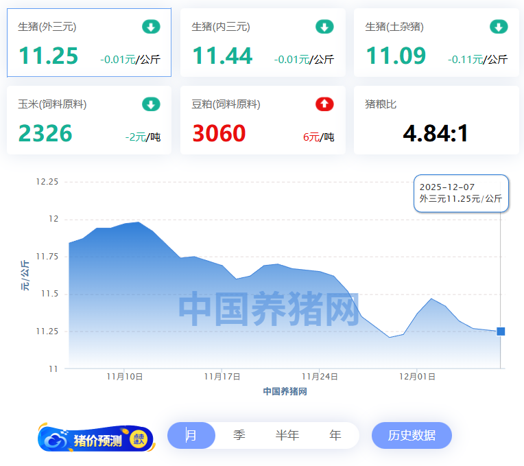 全国(生猪品种:外三元)均价为11.25元/公斤,猪价较昨日下跌0.01元/公斤,环比下跌5.22%,同比下跌28.44%;
