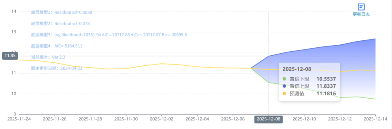 玄田算法是由项目课题组团队原创的非经典逻辑数值聚合理论和不确定性预测方法,构建了基于一致模算子的生猪价格预测模型。该模型采用的聚合函数及一致模相关理论与方法已获得多项国家自然科学基金和省级自然科学资金资助,并获得多项省级自然科学奖奖项。12月08日预测猪价为11.1816,置信区间在10.5537--11.8337之间。12月09日预测猪价为11.2087;12月10日预测猪价为11.1803。