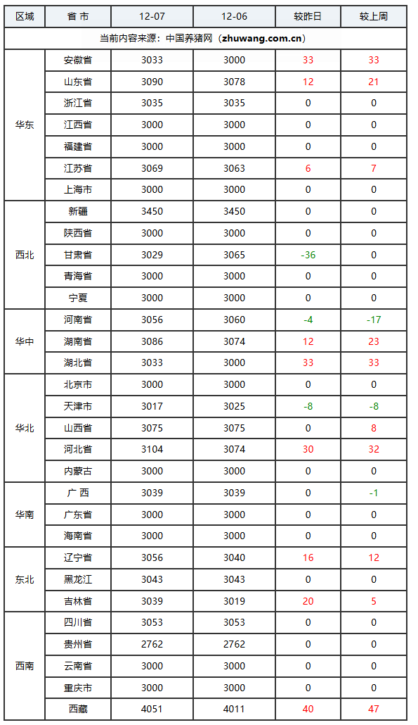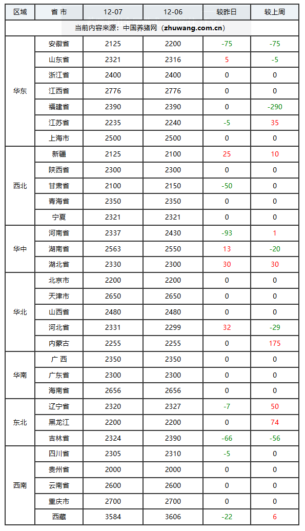 猪价下跌地区(13个):浙江省、江西省、福建省、陕西省、河南省、湖南省、湖北省、四川省、贵州省、山西省、广东省、西藏自治区、天津市;下跌区间:0.01-0.14元/公斤;