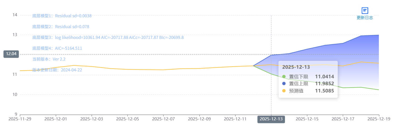 玄田算法是由项目课题组团队原创的非经典逻辑数值聚合理论和不确定性预测方法,构建了基于一致模算子的生猪价格预测模型。该模型采用的聚合函数及一致模相关理论与方法已获得多项国家自然科学基金和省级自然科学资金资助,并获得多项省级自然科学奖奖项。12月13日预测猪价为11.5085,置信区间在11.0414-11.9852之间。12月14日预测猪价为11.4097;12月15日预测猪价为11.4765。