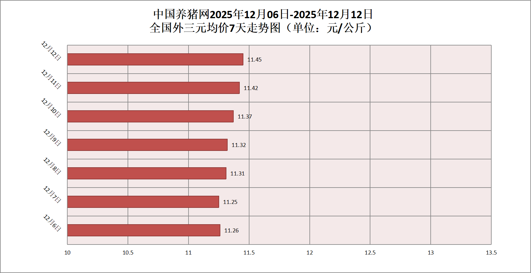 2025年12月12日(星期五),据中国养猪网猪价系统监测,全国外三元均价为11.45元/公斤,猪价较昨日(11.42元/公斤)上涨0.03元/公斤,较上月(11.92元/公斤)下跌了0.47元/公斤。