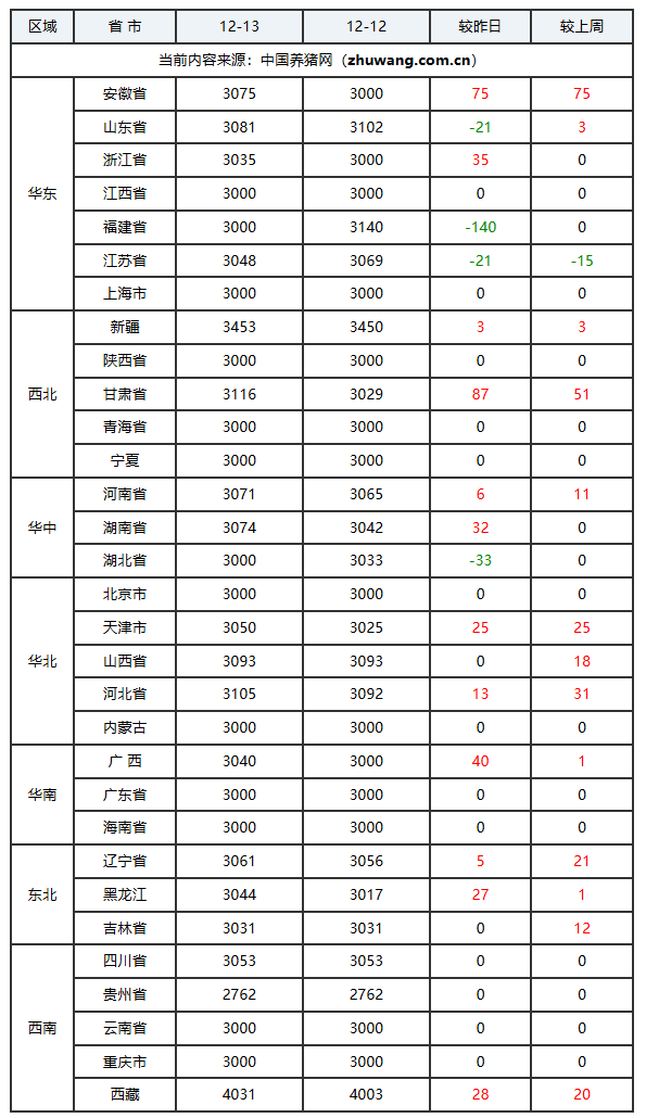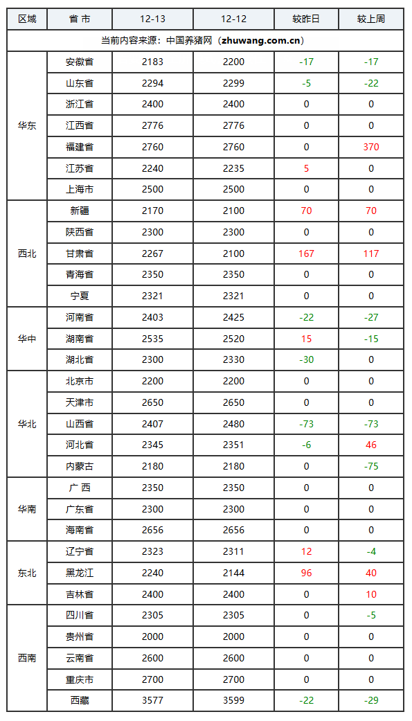 猪价上涨地区(17个):浙江省、海南省、江西省、山西省、云南省、陕西省、四川省、西藏自治区、安徽省、甘肃省、天津市、河北省、湖北省、江苏省、上海市、黑龙江省、山东省;上涨区间:0.01-0.21元/公斤;
