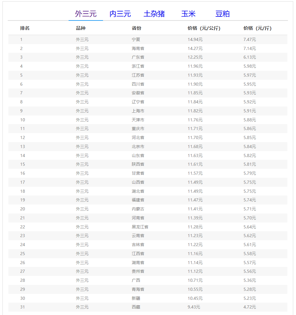 外三元排行前三:宁夏回族自治区14.94元/公斤、海南省14.27元/公斤、广东省12.25元/公斤;
