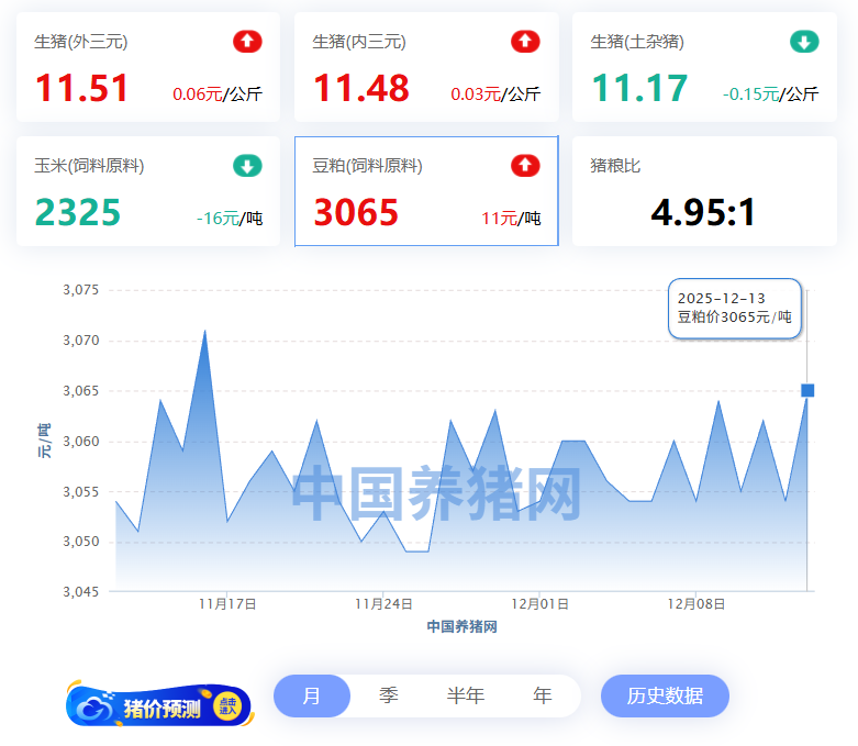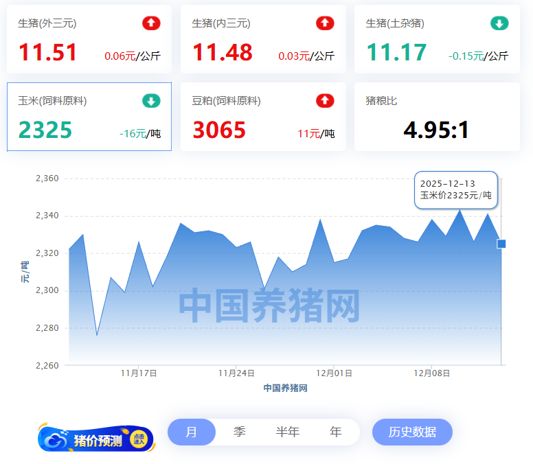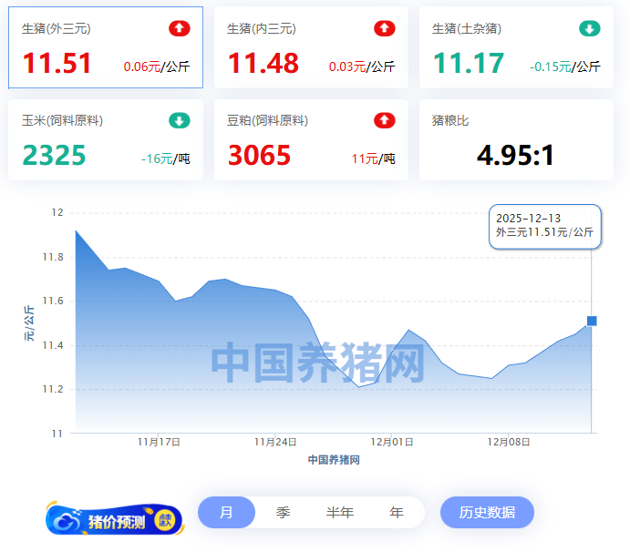 全国(生猪品种:内三元)均价为11.48元/公斤,猪价较昨日上涨0.03元/公斤,环比下跌4.73%,同比下跌27.57%;