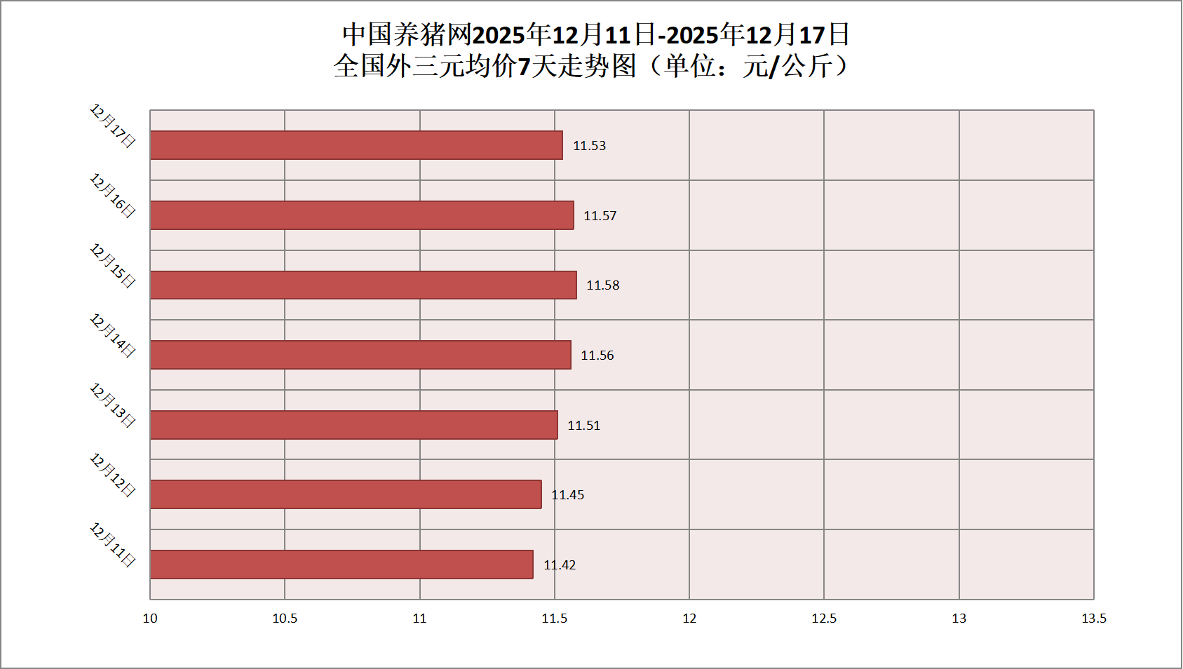 2025年12月17日(星期三),据中国养猪网猪价系统监测,全国外三元均价为11.53元/公斤,猪价较昨日(11.56元/公斤)下跌0.04元/公斤,较上月(11.69元/公斤)下跌了0.16元/公斤。