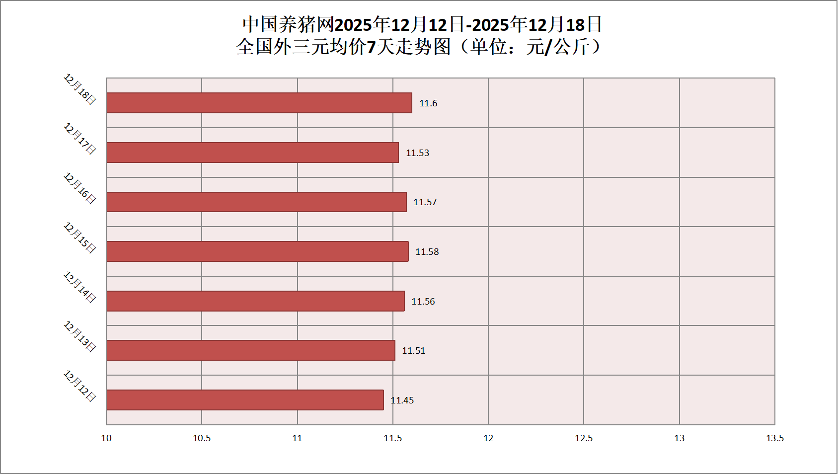2025年12月18日(星期四),据中国养猪网猪价系统监测,全国外三元均价为11.53元/公斤,猪价较昨日(11.53元/公斤)上涨0.07元/公斤,较上月(11.6元/公斤)下跌了0.00元/公斤。