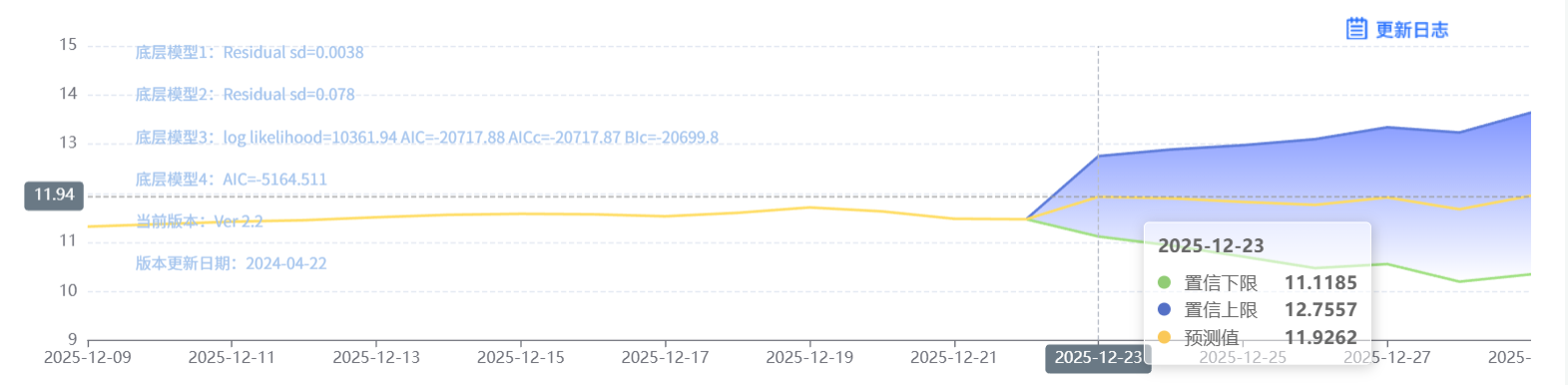 玄田算法是由项目课题组团队原创的非经典逻辑数值聚合理论和不确定性预测方法,构建了基于一致模算子的生猪价格预测模型。该模型采用的聚合函数及一致模相关理论与方法已获得多项国家自然科学基金和省级自然科学资金资助,并获得多项省级自然科学奖奖项。12月23日预测猪价为11.9262,置信区间在11.1185--12.7557之间。12月24日预测猪价为11.8967;12月25日预测猪价为11.8224。