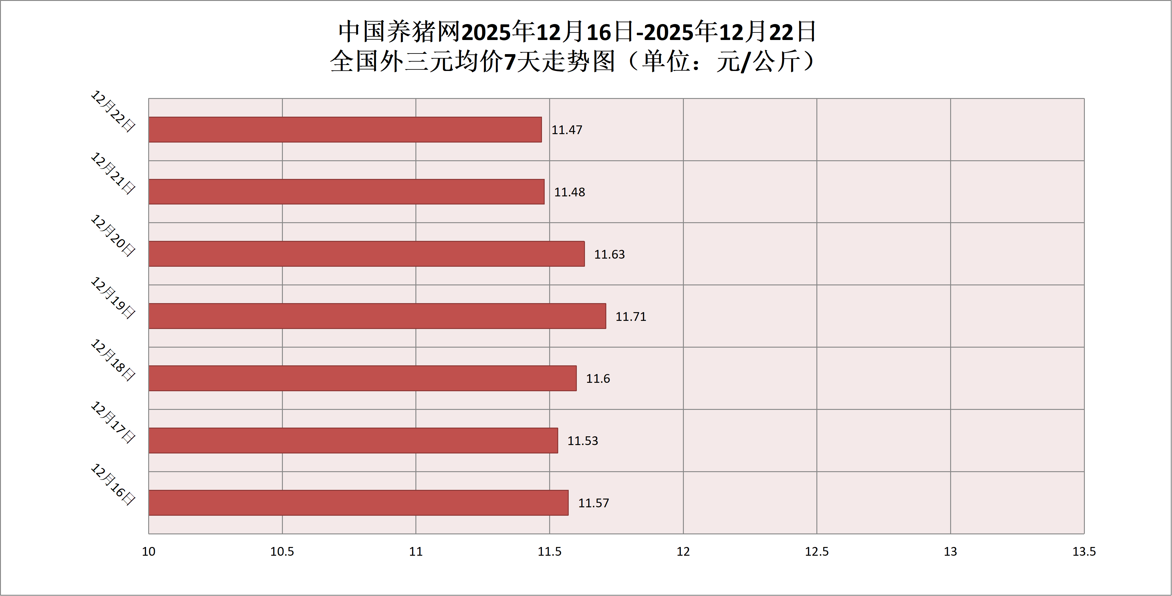 2025年12月22日(星期一),据中国养猪网猪价系统监测,全国外三元均价为11.47元/公斤,猪价较昨日(11.48元/公斤)下跌0.01元/公斤,较上月(11.67元/公斤)下跌了0.20元/公斤。