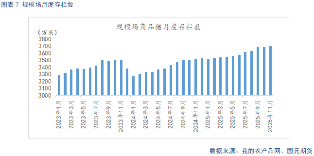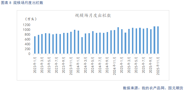 据Mysteel统计,截至2025年11月底,样本规模场能繁母猪存栏量为502.94万头,环比下降0.37%,同比增长0.07%。11月,气温持续下降,冬季疫病防控难度加大,叠加猪价低迷,行业亏损状态延续,规模场产能回落。从生产周期推算,2025年规模场理论产能仍呈现环比上升态势,产能调控若顺利推进,实际兑现效果也要等到26年二季度后,后续也要持续观察产能调控的持续性。样本规模场11月商品猪存栏数为3700.59万头,环比增加0.32%,同比增加5.28%。样本规模场11月商品猪出栏量为1136.49万头,环比减少0.65%,同比增加15.59%。规模场年底冲量,出栏压力较大。加之亏损状态下,养殖端整体认卖情绪尚可,12月预计出栏量将出现回升。