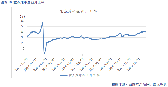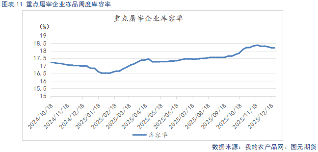 截至12月25日,重点屠宰企业开工率为39.59%,较上月末环比回升2.18%。冷冻肉库容率18.18%,较上月末环比下降0.12%。冬至过后,腌腊活动逐步进入高峰,叠加元旦及后续春节,需求步入季节性复苏阶段。不过年关较晚,年前备货还未集中启动,且需求窗口期拉长,整体需求提振力度相对有限。冻库库存方面,猪价虽小幅反弹,但仍处低位,腌腊、灌肠及居民消费对鲜肉需求较大,冻品去库缓慢。