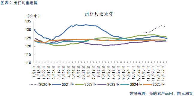 截至12月26日,生猪出栏均重123.55公斤,较上月末环比下跌0.11公斤。本月上旬,在冬季疫病威胁下,养殖端大猪出栏意愿较强,出栏均重小幅回升。临近月末,随着存栏均重下降,养殖端压栏情绪升温,带动出栏均重回落。