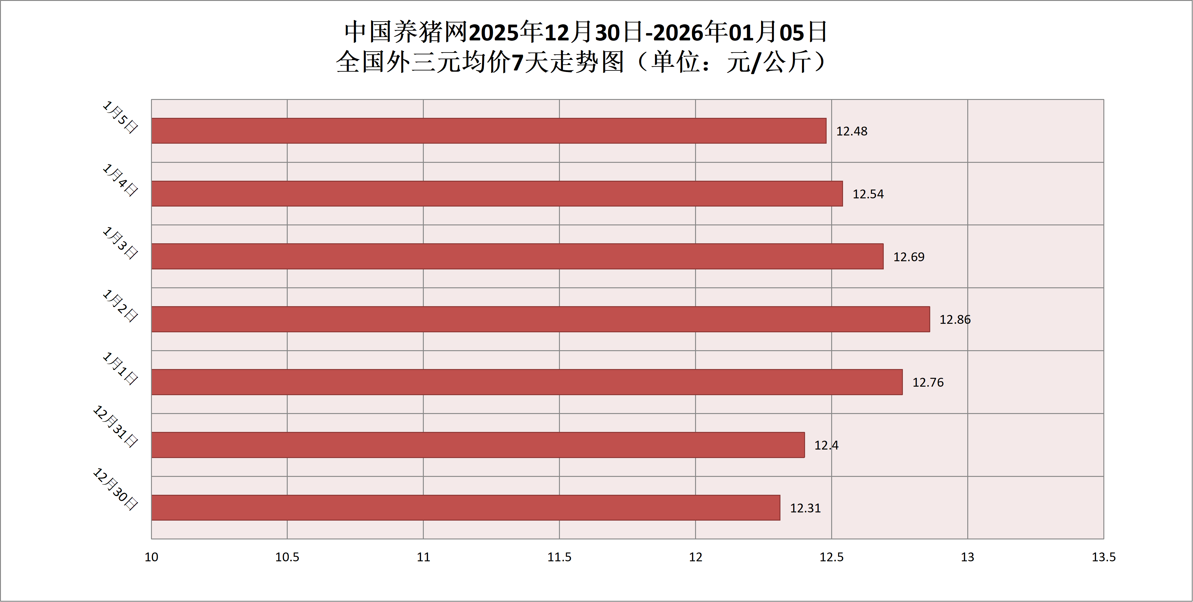2026年01月05日(星期一),据中国养猪网猪价系统监测,全国外三元均价为12.48元/公斤,猪价较昨日(12.54元/公斤)下跌0.06元/公斤,较上月(11.27元/公斤)上涨了1.21元/公斤。