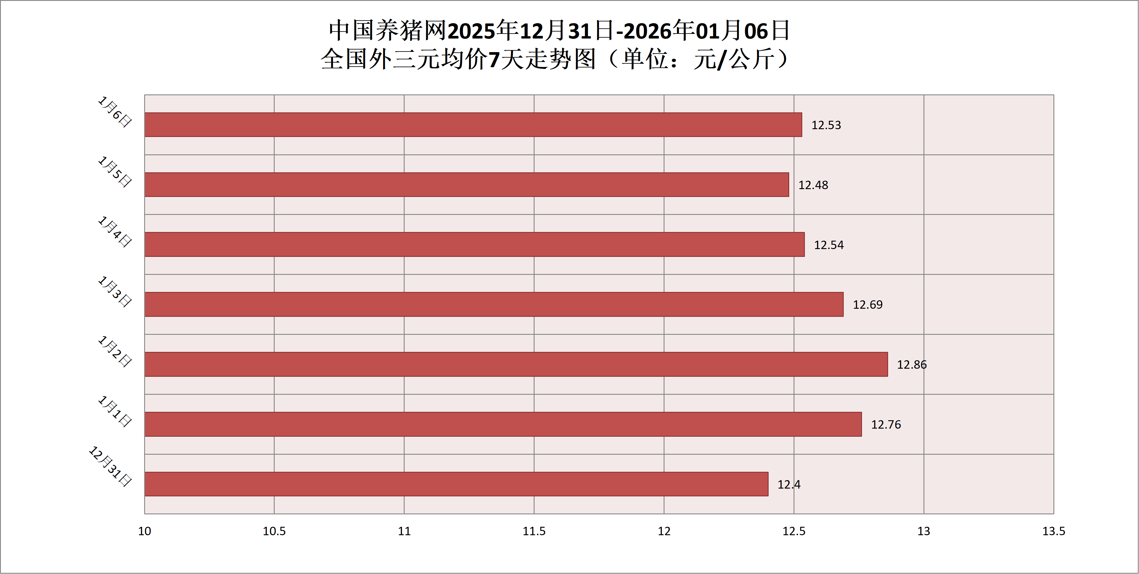 2026年01月06日(星期二),据中国养猪网猪价系统监测,全国外三元均价为12.53元/公斤,猪价较昨日(12.48元/公斤)上涨0.05元/公斤,较上月(11.26元/公斤)上涨了1.27元/公斤。