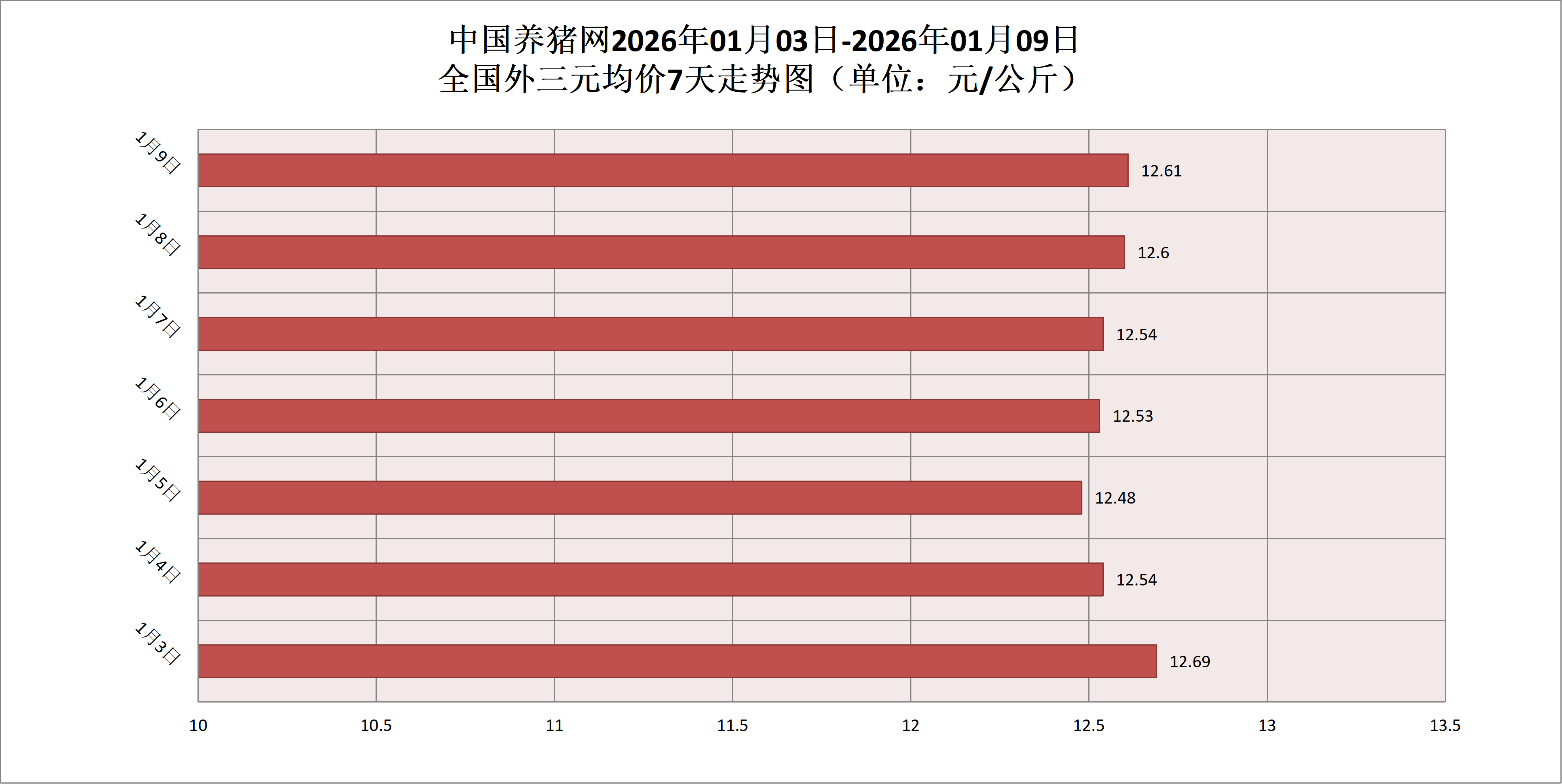 2026年01月09日(星期五),据中国养猪网猪价系统监测,全国外三元均价为12.61元/公斤,猪价较昨日(12.60元/公斤)上涨0.01元/公斤,较上月(11.32元/公斤)上涨了1.29元/公斤。