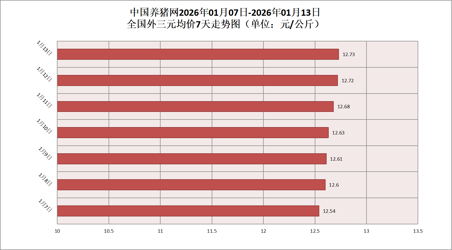 2026年01月13日(星期二),据中国养猪网猪价系统监测,全国外三元均价为12.73元/公斤,猪价较昨日(12.72元/公斤)上涨0.01元/公斤,较上月(11.51元/公斤)上涨了1.22元/公斤。
