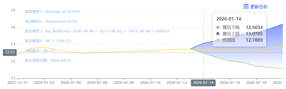 玄田算法是由项目课题组团队原创的非经典逻辑数值聚合理论和不确定性预测方法,构建了基于一致模算子的生猪价格预测模型。该模型采用的聚合函数及一致模相关理论与方法已获得多项国家自然科学基金和省级自然科学资金资助,并获得多项省级自然科学奖奖项。01月14日预测猪价为12.6957,置信区间在12.2098--13.1891之间。01月15日预测猪价为12.8316;01月16日预测猪价为12.7891。