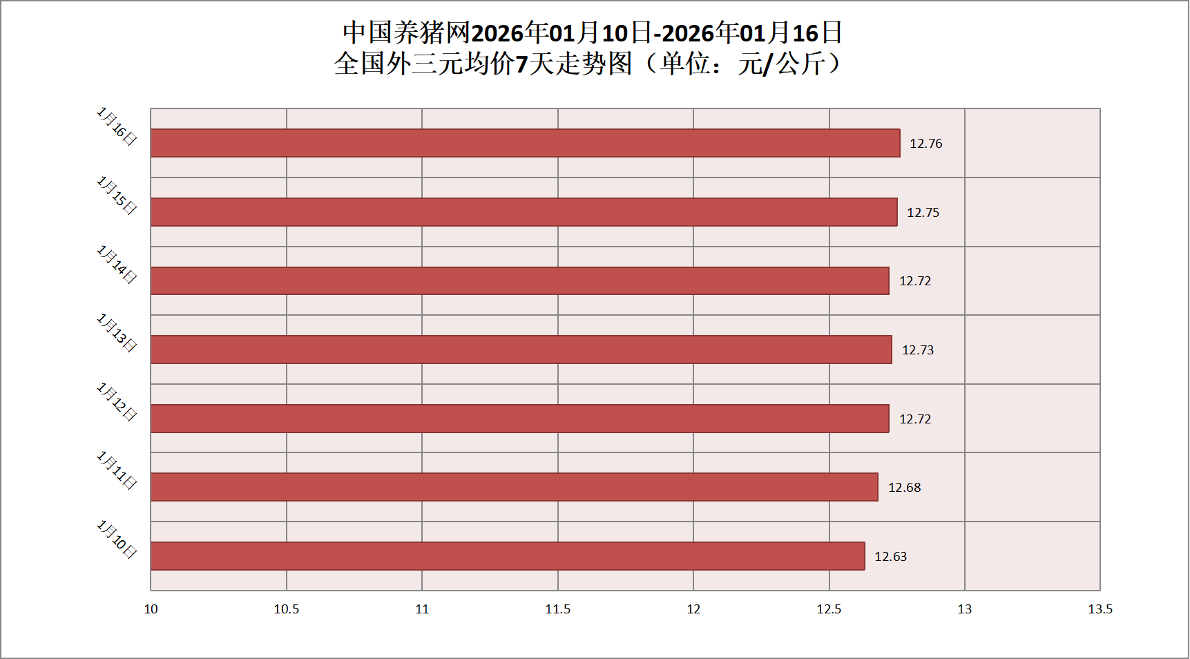 2026年01月16日(星期五),据中国养猪网猪价系统监测,全国外三元均价为12.76元/公斤,猪价较昨日(12.75元/公斤)上涨0.01元/公斤,较上月(11.57元/公斤)上涨了1.19元/公斤。