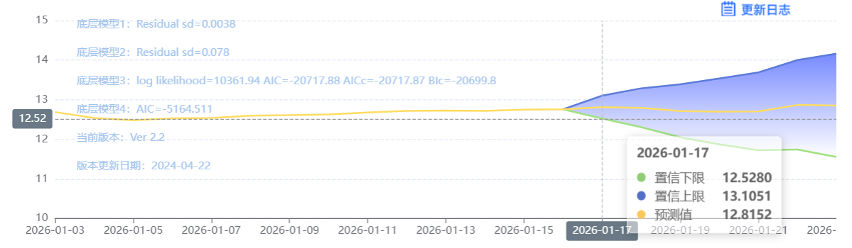 玄田算法是由项目课题组团队原创的非经典逻辑数值聚合理论和不确定性预测方法,构建了基于一致模算子的生猪价格预测模型。该模型采用的聚合函数及一致模相关理论与方法已获得多项国家自然科学基金和省级自然科学资金资助,并获得多项省级自然科学奖奖项。01月17日预测猪价为12.7885,置信区间在12.3037--13.2828之间。01月18日预测猪价为12.8674;01月19日预测猪价为12.8764。