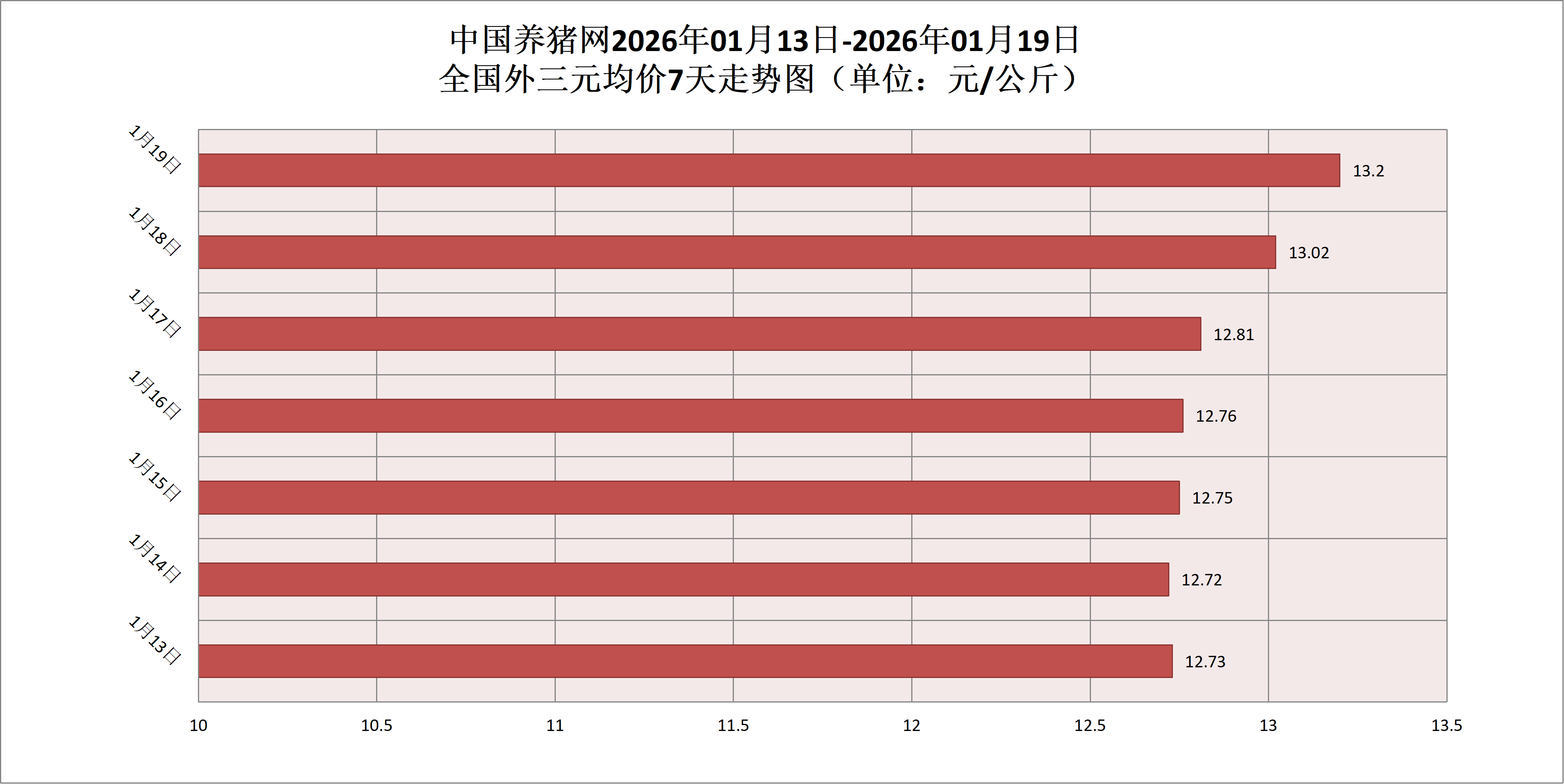 2026年01月19日(星期一),据中国养猪网猪价系统监测,全国外三元均价为13.20元/公斤,猪价较昨日(13.02元/公斤)上涨0.18元/公斤,较上月(11.71元/公斤)上涨了1.49元/公斤。