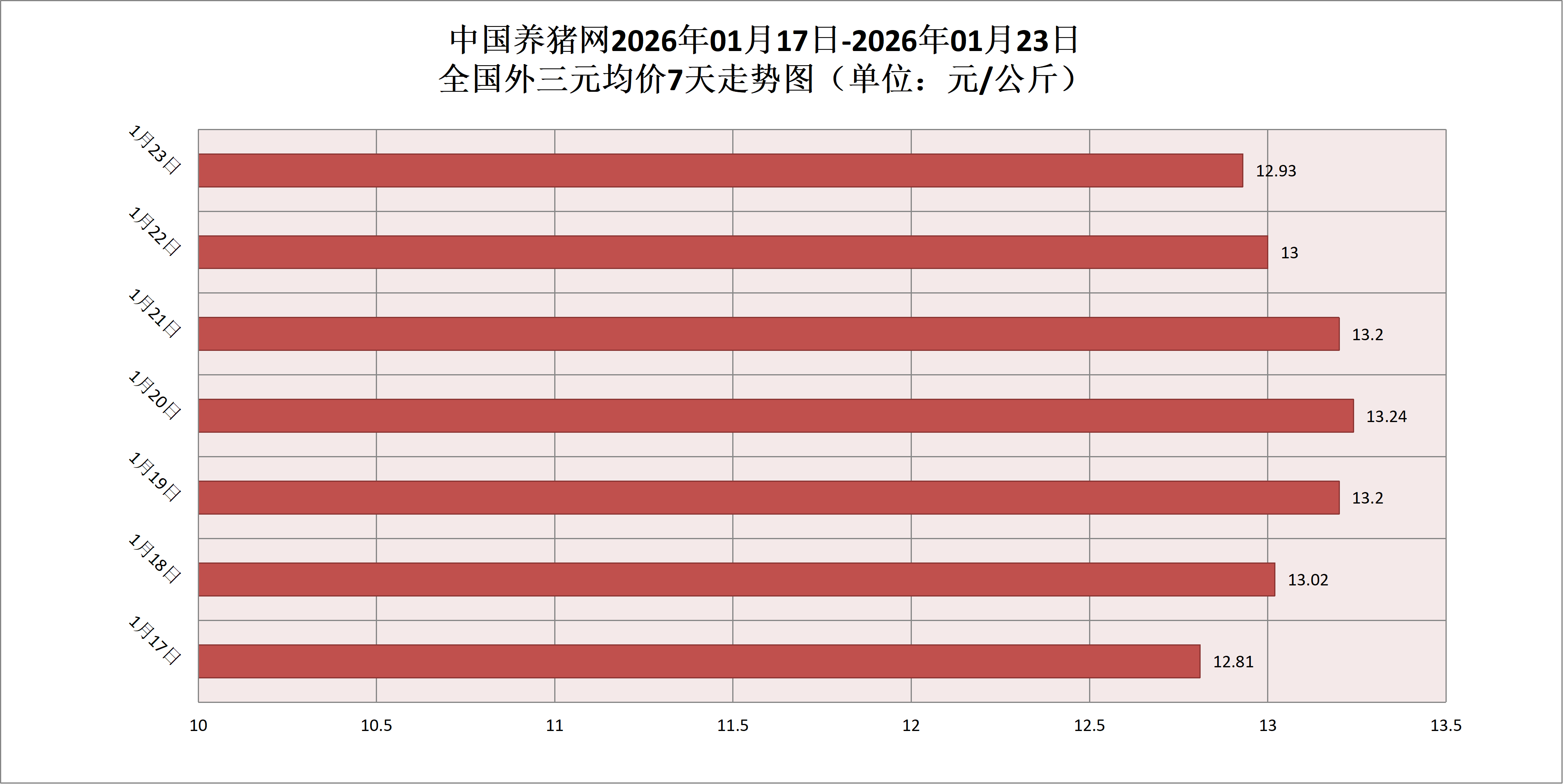 2026年01月23日(星期五),据中国养猪网猪价系统监测,全国外三元均价为12.93元/公斤,猪价较昨日(13元/公斤)下跌0.07元/公斤,较上月(11.49元/公斤)上涨了1.44元/公斤。