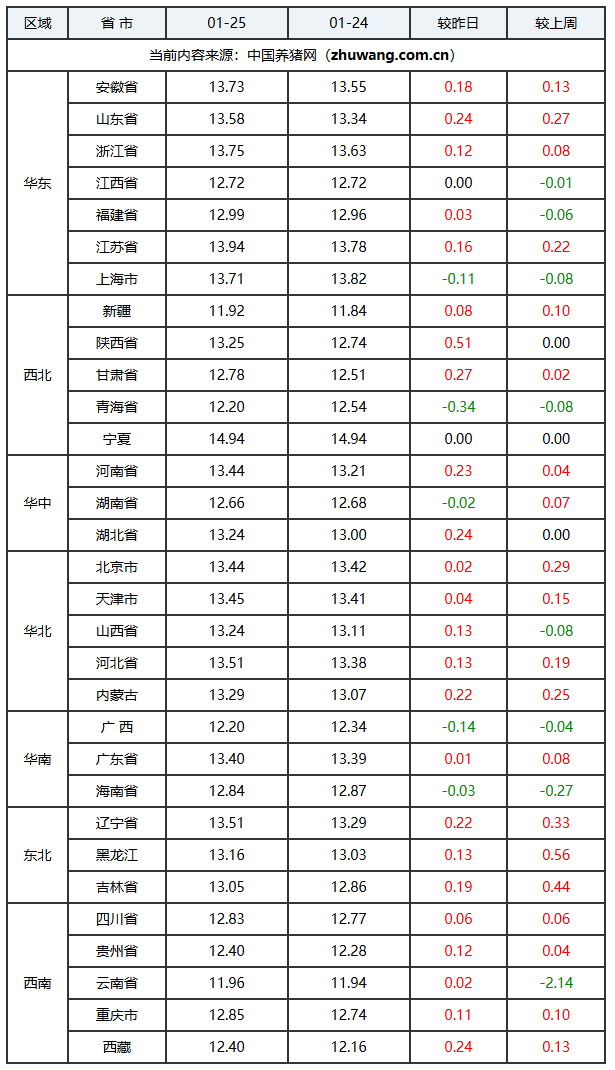 猪价上涨地区(24个):安徽省、河南省、湖北省、天津市、河北省、内蒙古自治区、黑龙江省、四川省、北京市、山东省、西藏自治区、浙江省、辽宁省、江苏省、陕西省、甘肃省、山西省、吉林省、福建省、新疆维吾尔自治区、广东省、云南省、贵州省、重庆市;上涨区间:0.01-0.51元/公斤;